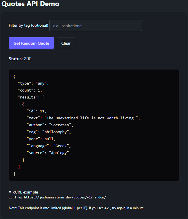 It provides an endpoint to retrieve random quotes for filtering by tags, making it a practical example of building a consumable micro-API.